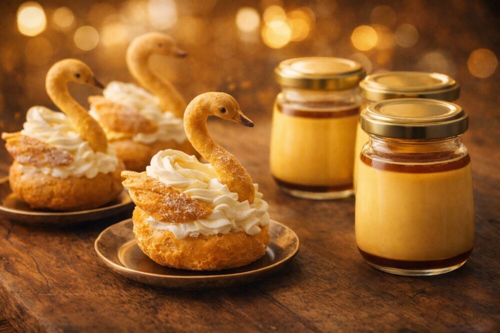 リブートのスイーツは、ガラス瓶入りで並べやすい「瓶プリン」や、形が分かりやすい「スワンシュー(白鳥シュー)」のようなシュー系が“画”になりやすいです。洋菓子店のショーケースに置かれる王道ケーキも登場しやすく、映った瞬間に特定が進むタイプです。