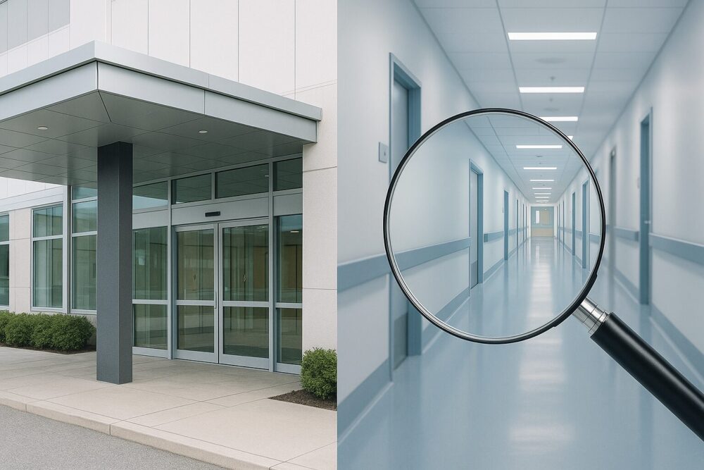 病院特定は「建築の規格」を見るのが一番早く、玄関庇・サイン・床材・手すりの“規格の重なり”が鍵です。